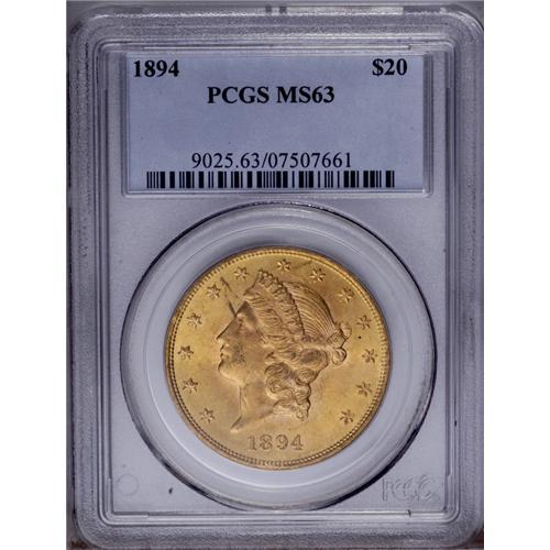 <B>1894<$20> MS63 PCGS.</B></I> Lustrous and well struck. Rich reddish-gold coloration is occasionally interrupted by minor abrasions and brief toning streaks, mainly in the fields. Relatively common in this grade, but very scarce any finer.
