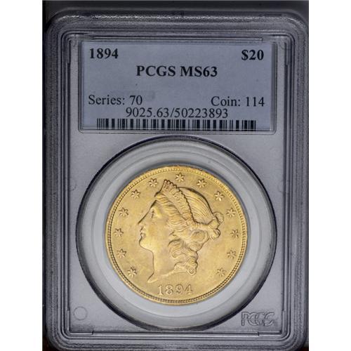 1894 $20 MS63 PCGS. Select with excellent, brightly lu