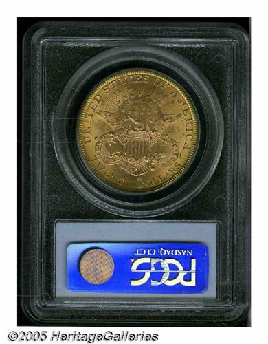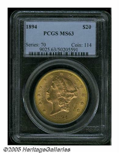 <B>1894<$20> MS63 PCGS.</B></I> The design elements are well brought up on this '94 double eagle, and the lustrous surfaces display honey-gold patination. Scattered light contact marks on the obverse limit the grade. PCGS has seen 76 coins grading higher (5/05).