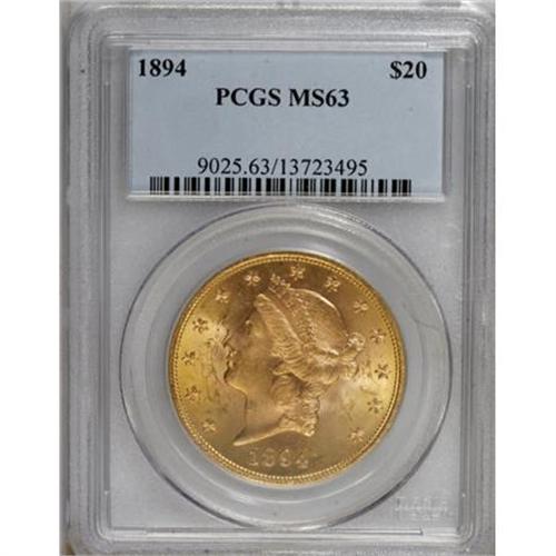 <B>1894 $20 MS63 PCGS.</B></I> This alertly struck double eagle is pleasantly unabraded aside from minor chatter on the left obverse field. Scarce any finer, although bagmarked examples are available.<BR><BR><B>Coin Engraver:</B> James B. Longacre<BR><BR><b>Shipping:</b> Coins & Currency (<a target="_blank" href="http://www.heritageauctions.com/common/shipping.php">view shipping information</a>)