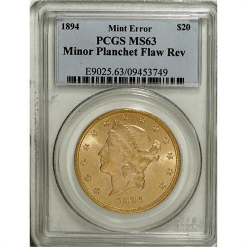 <B>1894 $20 Double Eagle--Minor Planchet Flaw Reverse--MS63 PCGS.</B></I><BR><BR><B>Coin Engraver:</B> James B. Longacre<BR><BR><b>Shipping:</b> Coins & Currency (<a target="_blank" href="http://www.heritageauctions.com/common/shipping.php">view shipping information</a>)