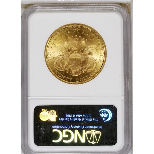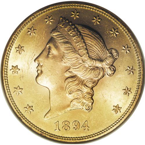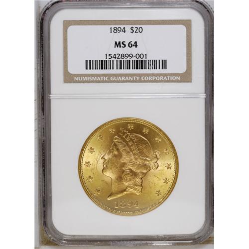 <B>1894 $20 MS64 NGC.</B></I> This apricot-gold representative features booming luster and an attentive strike. The reverse is well preserved, while the cheek and obverse field are only moderately abraded. Another conditionally rare issue within the Type Three series, since no regard was given to the numismatic value of such pieces until well into the 20th century.<BR><BR><b>Shipping:</b> Coin/Currency (<a target="_blank" href="http://www.heritageauctions.com/common/shipping.php">view shipping information</a>)