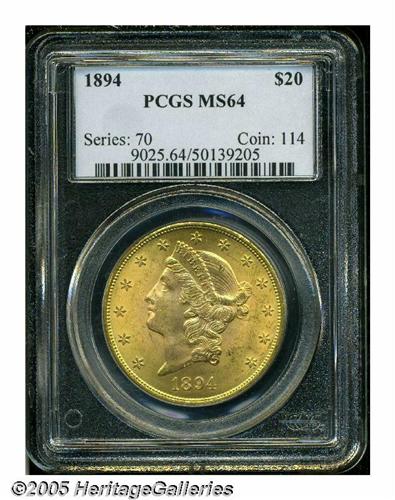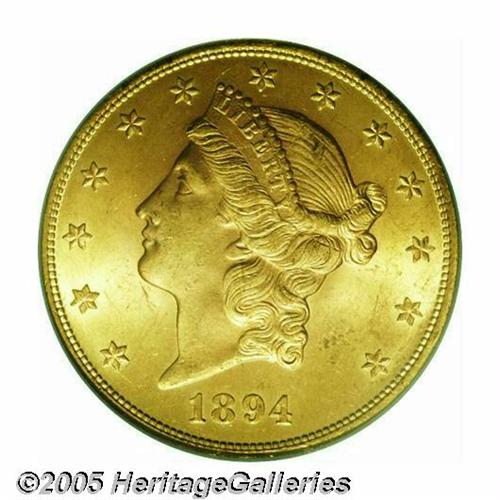 <B>1894<$20> MS64 PCGS.</B></I> A much above-average Uncirculated example that benefits from a lovely soft, frosted finish and sparingly abraded surfaces. Only a handful of Gems are known, making this satiny representative all the more desirable.