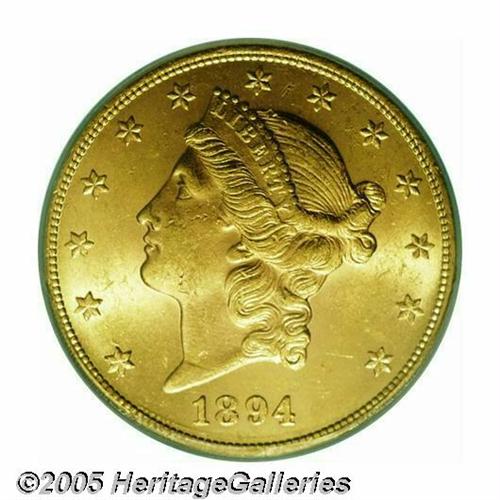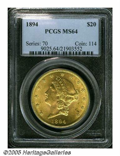 <B>1894<$20> MS64 PCGS.</B></I> Fully struck with lovely satin-like surfaces that are minimally abraded and quite attractive overall. Scarce in this grade, and quite rare finer. Population: 73 in 64, 1 finer (4/05).