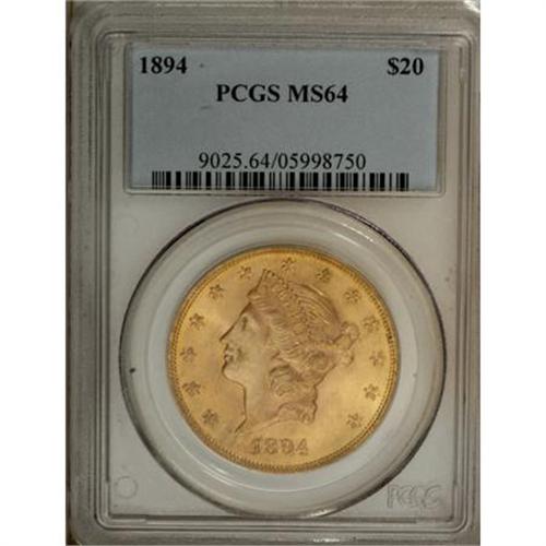 <B>1894 $20 MS64 PCGS.</B></I> The generous P-mint emission was nearly 1.4 million, so survivors are generally available up through MS63, but much less so in MS64. This piece offers deep, lustrous orange-gold surfaces with tinges of greenish-gold, free of singular abrasions and with a bold strike. Population: 88 in 64, 1 finer (12/07).<BR><BR><B>Coin Engraver:</B> James B. Longacre<BR><BR><b>Shipping:</b> Coins & Currency (<a target="_blank" href="http://www.heritageauctions.com/common/shipping.php">view shipping information</a>)