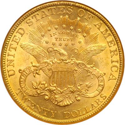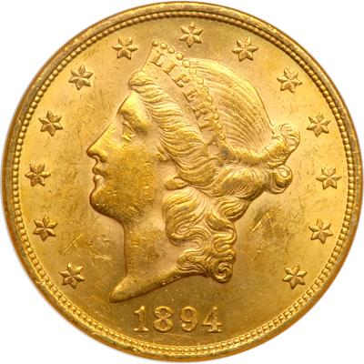 1894 $20. NGC graded MS-61. Lovely golden orange shades are displayed on both sides. A large number of double eagles found their way into European bank vaults in the up to the time of the great depression, and later after WWII. The Swiss banks, among others, began selling them to gold jobbers in the United States in the 1960s and 1970s, the source of many of these lustrous Mint State twenties. There is a misconception among historians that the Franklin Roosevelt administration melted most of the gold in 1933-37, but the evidence goes contrary to this belief.