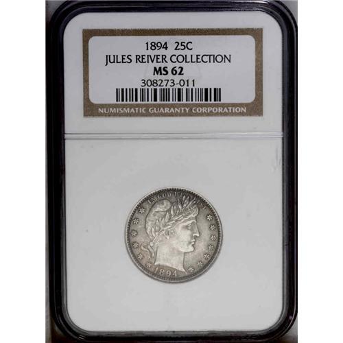 <B>1894<25C> MS62 NGC.</B></I> Apple-green, ruby-red, and gold colors endow the reverse. The moderately abraded obverse is draped in dappled chestnut, aqua, and pearl-gray tones. This well struck piece displays vibrant cartwheel shimmer. Scarce in Mint State, although not rare by the standards of the series.