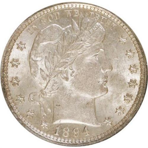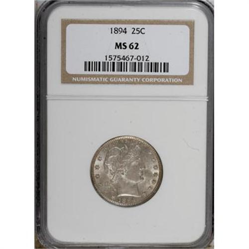 <B>1894 25C MS62 NGC.</B></I> NGC Census: (22/85). PCGS Population (24/90). Mintage: 3,432,972. Numismedia Wsl. Price for NGC/PCGS coin in MS62: $283. (#5607)<BR><BR><B>Coin Engraver:</B> Charles E. Barber<BR><BR><b>Shipping:</b> Coins & Currency (<a target="_blank" href="http://www.heritageauctions.com/common/shipping.php">view shipping information</a>)