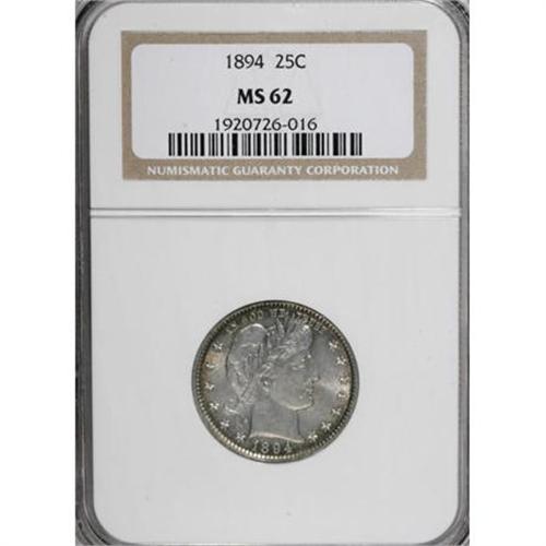 <B>1894 25C MS62 NGC.</B></I> NGC Census: (22/89). PCGS Population (24/97). Mintage: 3,432,972. Numismedia Wsl. Price for NGC/PCGS coin in MS62: $275. (#5607)<BR><BR><B>Coin Engraver:</B> Charles E. Barber<BR><BR><b>Shipping:</b> Coins & Currency (<a target="_blank" href="http://www.heritageauctions.com/common/shipping.php">view shipping information</a>)