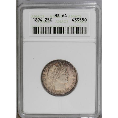 1894 25C MS64 ANACS. A bold striking with intense, sat 1894[25C] MS64 ANACS.
