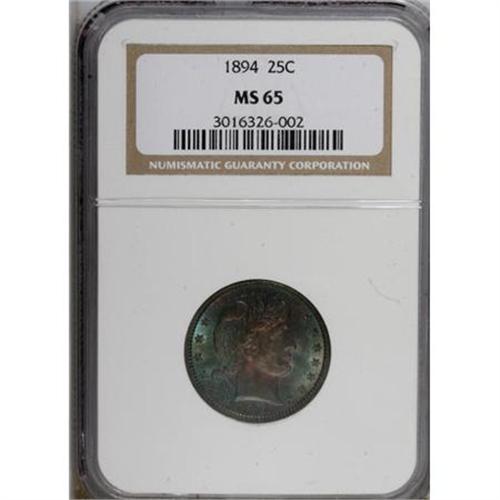 <B>1894 25C MS65 NGC.</B></I> Deep jade-green and plum-red endow the obverse, while the reverse features cherry-red and olive shades. Lustrous and needle-sharp with exemplary preservation. Census: 20 in 65, 5 finer (8/07).<BR><BR><B>Coin Engraver:</B> Charles E. Barber<BR><BR><b>Shipping:</b> Coins & Currency (<a target="_blank" href="http://www.heritageauctions.com/common/shipping.php">view shipping information</a>)