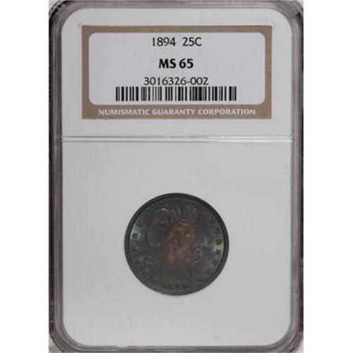 <B>1894 25C MS65 NGC.</B></I> Deep jade-green and plum-red endow the obverse, while the reverse features cherry-red and olive shades. Lustrous and needle-sharp with exemplary preservation. Census: 22 in 65, 5 finer (1/08).<BR><BR><B>Coin Engraver:</B> Charles E. Barber<BR><BR><b>Shipping:</b> Coins & Currency (<a target="_blank" href="http://www.heritageauctions.com/common/shipping.php">view shipping information</a>)