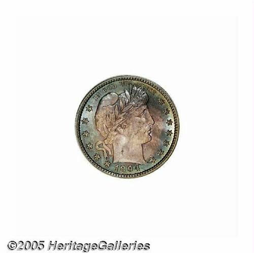 <B>1894<25C> MS66 PCGS.</B></I> A beautiful, wholly original Premium Gem that benefits from pinpoint sharpness over the major design elements. The obverse features concentric shades of steel-violet and cobalt-blue while a slightly deeper mix of multicolored toning covers the reverse. Population: 6 in 66, 1 finer (6/05).