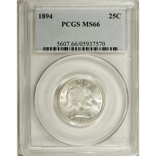 <B>1894 25C MS66 PCGS.</B></I> Frosty and delightful with just a touch of ice-blue patina at the margins. The strike is solid, and only a handful of trivial grazes appear on each side. A single spot of cloud-gray patina is noted between the eagle's wing and the arrowheads. PCGS has graded only one coin finer (4/07), a testament to how elusive this early issue can be in high grades.<BR><BR><b>Shipping:</b> Coins & Currency (<a target="_blank" href="http://www.heritageauctions.com/common/shipping.php">view shipping information</a>)