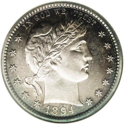<B>1894<25C> PR63 NGC.</B></I> Turquoise and lilac patination graces the obverse periphery, while the reverse margins are visited by electric-blue, lavender, and golden-brown toning. The design features are sharply impressed over each side. Wispy slide marks are noted on Liberty's cheek and neck. From a mintage of 972 pieces..