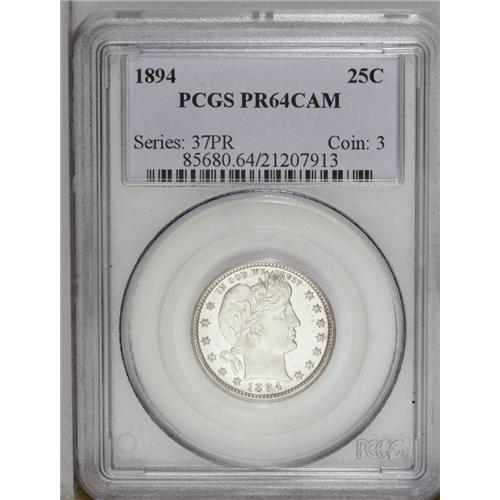 <B>1894<25C> PR64 Cameo PCGS.</B></I> Nicely frosted devices compare with glassy, smooth fields. A nearly brilliant near-Gem with clean surfaces and good eye appeal. 972 proofs were struck. Population: 7 in 64 Cameo, 25 finer (2/06).
