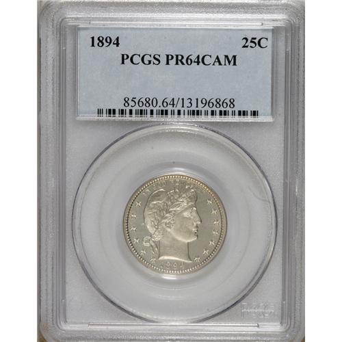 <B>1894 25C PR64 Cameo PCGS.</B></I> Several hundred 1894 proof quarters, from a mintage of 972 pieces, have been certified by PCGS and NGC; fewer than 90 examples have been assigned the Cameo designation. The untoned near-Gem Cameo in this lot exhibits pronounced contrast and sharply defined design elements. Some light obverse handling marks define the grade.<BR><BR><b>Shipping:</b> Coins & Currency (<a target="_blank" href="http://www.heritageauctions.com/common/shipping.php">view shipping information</a>)