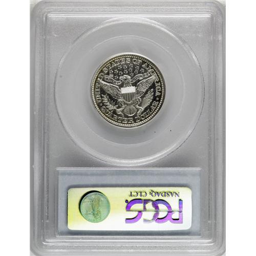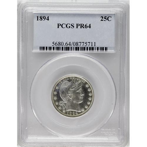 <B>1894 25C PR64 PCGS.</B></I> Some field-device contrast is noted on each side, although unacknowledged by PCGS. A couple of light contact marks on the cheek constitute the grade on this silver-gold piece, one of only 972 proofs minted during this year. Much eye appeal is present, however. Population: 78 in 64, 74 finer (1/07).<BR><BR><b>Shipping:</b> Coins & Currency (<a target="_blank" href="http://www.heritageauctions.com/common/shipping.php">view shipping information</a>)