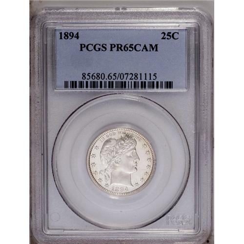 <B>1894<25C> PR65 Cameo PCGS.</B></I> A barely discernible veneer of tan-gold color resides in some of the border areas of this exquisitely struck Gem proof that displays excellent field to motif contrast. Some very light pinscratch-like marks are noted on Liberty's cheek and in the right (facing) obverse field. Population: 14 in 65, 11 finer (2/06).