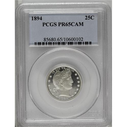<B>1894<25C> PR65 Cameo PCGS.</B></I> Splendid white-on-black contrast is evident on each side of this bright, untoned specimen. The devices are well struck and heavily frosted, while the jet-black fields betray endless depths of mirrored reflectivity. Free of bothersome hairlines or handling marks. Just 972 proofs were struck. Population: 15 in 65 Cameo, 11 finer (3/06).