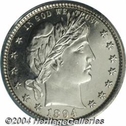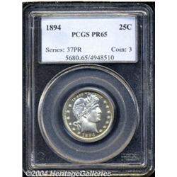 <B>1894<25C> PR65 PCGS.</B></I> An upper-end example of this early date in the Barber series. Deeply mirrored in the fields, the devices are well frosted and yield a pleasing two-toned effect. Almost colorless.<BR><I>From the JFS Collection.</B></I> <BR><BR><B>Important notice:</B> Heritage usually auctions material at the rate of 200-250 lots per hour. On some occasions eBay Live bid software or the Internet may not be able to keep up with the pace of the auction. We recommend placing a realistic absentee bid now as insurance to avoid disappointment. Occasionally the auctioneer may eliminate or reject an eBay Live bid, and the auctioneer may also reopen a lot after the close of the eBay live bidding (usually because we missed an audience bid), and may reject your bid even if it shows you as the winning bidder. By bidding via eBay Live, you agree that Heritage may award the lot to another bidder at its sole discretion under the circumstances described above or any other reasonable circumstances. Since eBay bids are not shown to us until we open the lot on the floor, we treat those bids just like floor bids. In most cases the floor responds before the eBay bid is presented to us, due to Internet lag time, so for consistency we have made it a policy that floor bids are always considered first over tie eBay live bids. Also please note that all Heritage lots purchased through eBay Live carry a 20% Buyer's Premium. Please make sure you read the Terms and Conditions before you bid. </span></font></tr></table></td></tr></table>