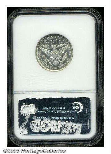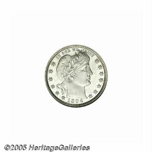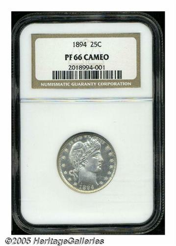 <B>1894<25C> PR66 Cameo NGC.</B></I> Fully brilliant, with boldly pronounced cameo contrast. Virtually all design features are sharply and deeply defined including Liberty's portrait, the obverse stars, and the eagle's plumage. Here's one of the finest survivors from a proof mintage of just 972 pieces. Population: 9 in 66, 8 finer (6/05).