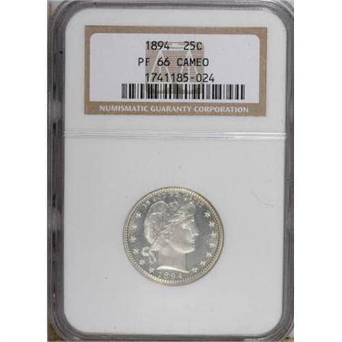 <B>1894 25C PR66 Cameo NGC.</B></I> This 1894 quarter reveals no discernible toning save for a glint of gold on the rims of both sides. Thick mint frost occurs on the devices that yield strong contrast with mirrored fields. Crisp definition is noted on the design elements, and there are no marks worthy of individual mention. From a proof mintage of 972 pieces. Census: 11 in 66 Cameo, 9 finer (6/07).<BR><BR><b>Shipping:</b> Coins & Currency (<a target="_blank" href="http://www.heritageauctions.com/common/shipping.php">view shipping information</a>\)