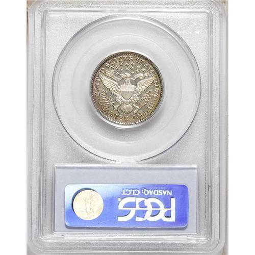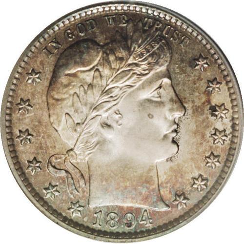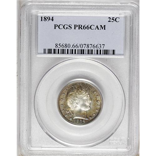 <B>1894 25C PR66 Cameo PCGS.</B></I> The obverse has a coating of golden-brown, gold, cobalt-blue, and purple-red that frames the bright and nearly untoned center, while the reverse has dusky sea-green and golden-tan patina. The strike is razor-sharp, with the corners of the shield and the fletchings all delivered with exquisite detail. The cameo contrast is attractive if not stark, and the surfaces are magnificently preserved. Just 972 pieces were struck. Population: 9 in 66 Cameo, 3 finer (9/06).<BR><BR><b>Shipping:</b> Coin/Currency (<a target="_blank" href="http://www.heritageauctions.com/common/shipping.php">view shipping information</a>)