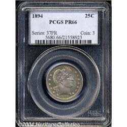 <B>1894<25C> PR66 PCGS.</B></I> Milky lilac, steel-blue, and apricot patina rests atop both sides of this peerless, modestly reflective specimen. Population: 15 in 66, 11 finer (3/04).<BR><I>Ex: Stack's Sale (5/90), lot 489, where it realized $861.</B></I> <BR><BR><B>Important notice:</B> Heritage usually auctions material at the rate of 200-250 lots per hour. On some occasions eBay Live bid software or the Internet may not be able to keep up with the pace of the auction. We recommend placing a realistic absentee bid now as insurance to avoid disappointment. Occasionally the auctioneer may eliminate or reject an eBay Live bid, and the auctioneer may also reopen a lot after the close of the eBay live bidding (usually because we missed an audience bid), and may reject your bid even if it shows you as the winning bidder. By bidding via eBay Live, you agree that Heritage may award the lot to another bidder at its sole discretion under the circumstances described above or any other reasonable circumstances. Since eBay bids are not shown to us until we open the lot on the floor, we treat those bids just like floor bids. In most cases the floor responds before the eBay bid is presented to us, due to Internet lag time, so for consistency we have made it a policy that floor bids are always considered first over tie eBay live bids. Also please note that all Heritage lots purchased through eBay Live carry a 20% Buyer's Premium. Please make sure you read the Terms and Conditions before you bid.