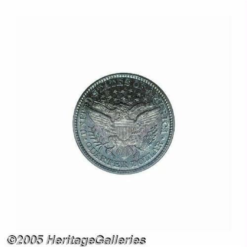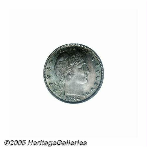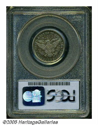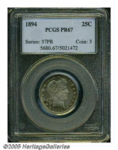 <B>1894<25C> PR67 PCGS.</B></I> This is a glorious example of Superb Gem quality with outstanding toning on both sides. Pale gold, sea-green, and violet toning grace the surfaces with underlying mirrored fields. This example easily qualifies as a cameo specimen, except that deeply toned Proofs generally do not receive such a designation. Despite so many old-time collections appearing for sale over the past decade, each with runs of 19th and early 20th century proof coinage, only one finer example has been certified by PCGS. Population: 10 in 67, 1 finer (5/05).