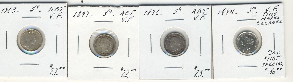 1894 5¢, 1896, 1897 & 1903. Lot of 4 coins all Abt VF with 1894 being cleaned. (PBA).