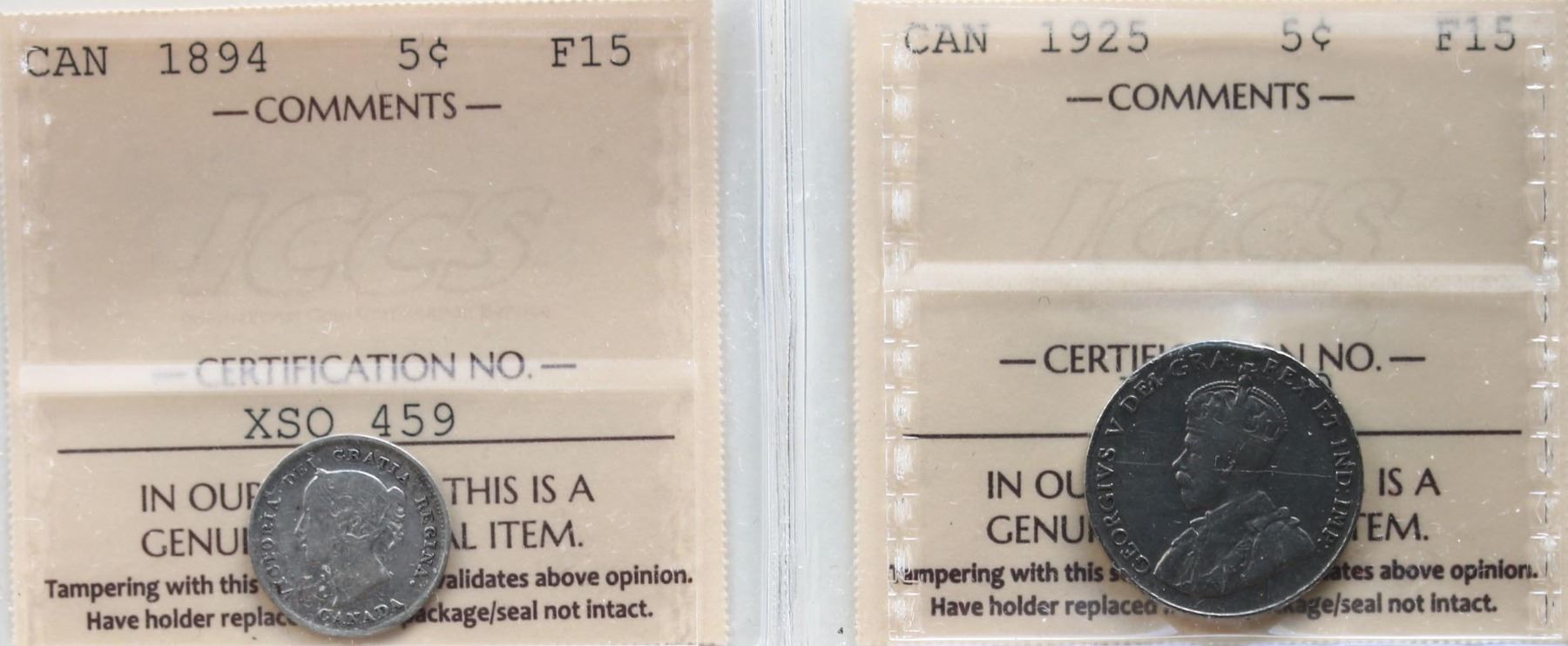 1894 5¢, 1925. Both coins ICCS Choice Fine-15