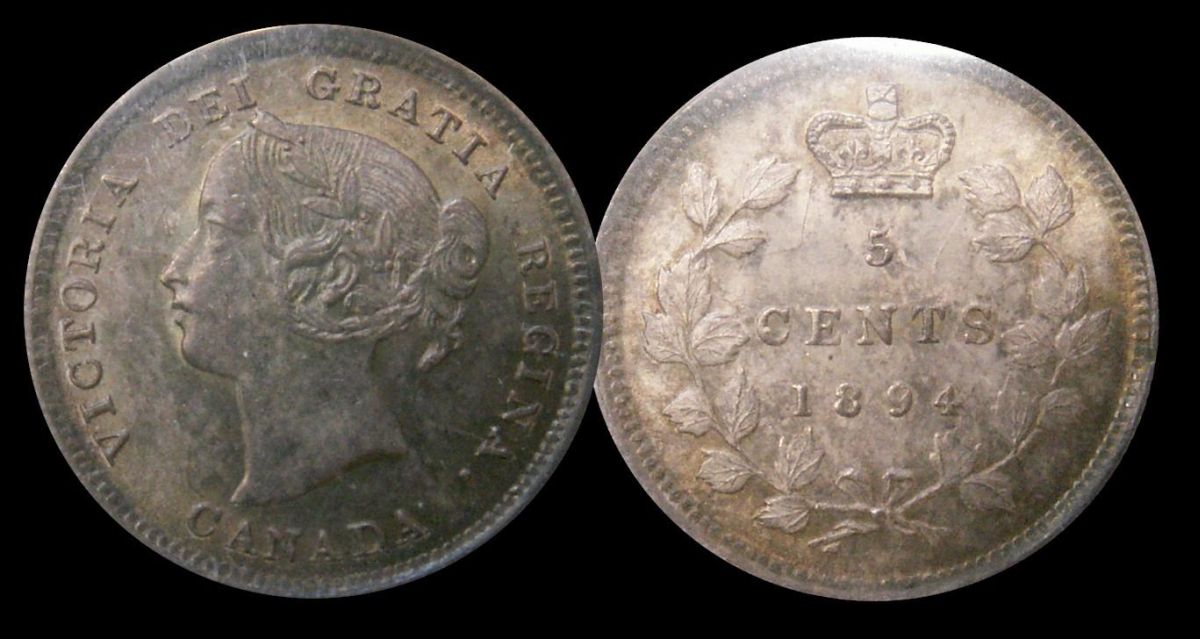 1894 5¢ ICCS MS64 PQ+ Attractive blue, gold, russet and green tones over full underlying luster.