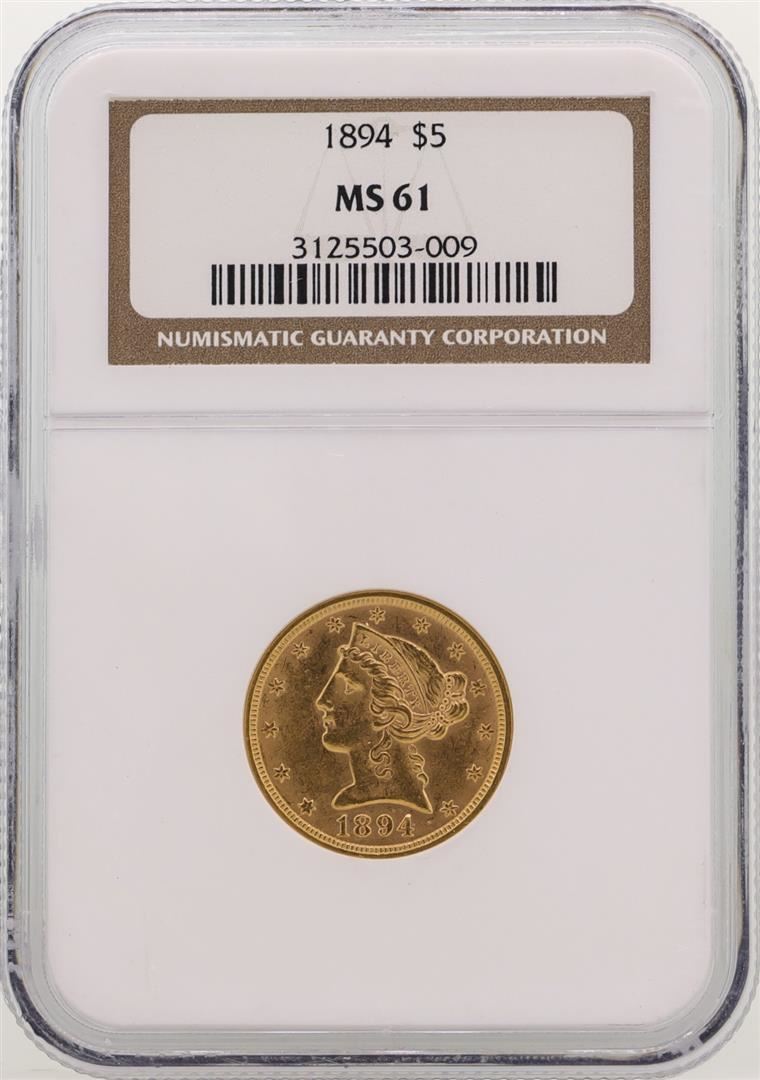 One 1894 $5 Liberty Head Half Eagle Gold Coin NGC MS61. NGC Certified.
