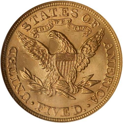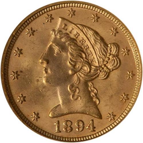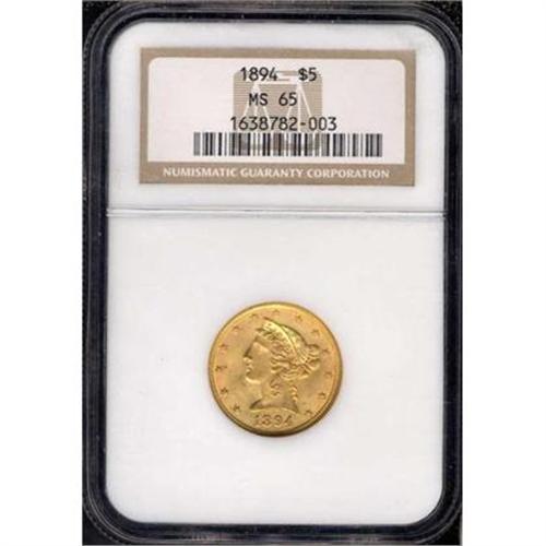 <b>1894 $5 Liberty. NGC graded MS65.</b> Blazing gold surfaces with intense luster and outstanding color plus visual appeal. Probably a good many are not as carefully struck as this 1894, with no suggestion or even a whisper of weakness at the centers <b>(PCGS # 8387)</b> <i>