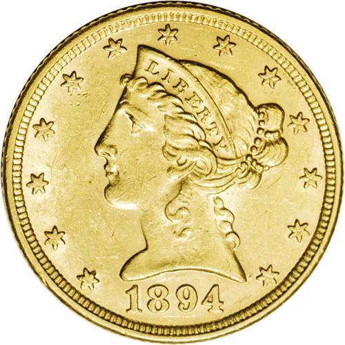 <B>1894<$5> MS61 NGC.</B></I> A hint of peach color affirms the originality of this shimmering Five Dollar gold piece, which has a moderately abraded obverse and a clean reverse. Philadelphia Mint Liberty Half Eagles dated between 1892 and the end of the series are readily available in Mint State. Envelope Included.