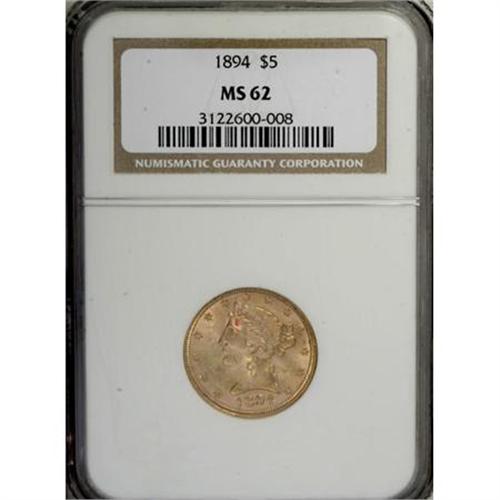 <B>1894 $5 MS62 NGC.</B></I> . NGC Census: (813/521). PCGS Population (313/183). Mintage: 957,800. Numismedia Wsl. Price for NGC/PCGS coin in MS62: $325. (#8387)<BR><BR><B>Coin Engraver:</B> Christian Gobrecht<BR><BR><b>Shipping:</b> Coins & Currency (<a target="_blank" href="http://www.heritageauctions.com/common/shipping.php">view shipping information</a>)
