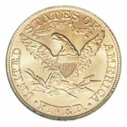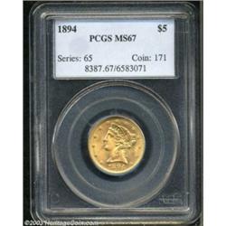 <table><tr><td><TABLE cellSpacing=0 cellPadding=0 width="100%" bgColor=#000000 border=0><TBODY> <TR><TD width="100%"><TABLE cellSpacing=1 cellPadding=3 width="100%" border=0><TBODY><TR><TD width="100%" bgColor=#79735c><FONT face=arial color=#ffffff size=3><B>Description</B> </FONT></TD></TR><TR><TD width="100%" bgColor=#ffffff><FONT face=arial size=2><B>1894 $5 MS67 PCGS.</B></I> In a word, this coin is simply spectacular. This Philadelphia mint issue is very scarce above the Select Uncirculated (MS63) level, and is downright rare as a Gem. PCGS has graded only 14 examples at the <I>MS64</B></I> level, and has yet to grade a single MS65 or MS66. NGC, on the other hand, has graded eight MS65s, but none at a higher grade. This coin stands alone as the finest of its kind, with no known coins even challenging it for finest known honors. The coin itself is powerfully struck, with sharp definition even in the smallest details of the eagle's breast feathers and in Liberty's hair. The luster is unblemished, with beautiful mint frost booming from each side. Literally only a couple of tiny abrasions are noticed even under magnification, and one would be hard pressed to imagine a prettier Half Eagle. Words can only partially describe beauty, and the magnificence of this example is only fully appreciated in its viewing. Population: 1 in 67, 0 finer (10/03). </FONT></TD></TR></TBODY></TABLE></TD></TR></TBODY></TABLE><BR><A name=PricesRealized></A><TABLE cellSpacing=0 cellPadding=0 width="100%" bgColor=#000000 border=0><TBODY><TR><TD width="100%"><TABLE cellSpacing=1 cellPadding=3 width="100%" border=0><TBODY><TR><TD width="100%" bgColor=#79735c><A name=PR><FONT face=arial color=#ffffff size=3><B>Previous Prices from Heritage Auctions</B> </FONT></A></TD></TR><TR><TD bgColor=#f6f6ed>No Prior Data Recorded </TD></TR><TR><TD bgColor=#ffffff><FONT face=arial size=1 ?>PLEASE NOTE: All prices realized reflect the final hammer price PLUS the buyer's premium in auctions that charge a buyer's premium. Each item has a notation at the top of the listing indicating whether that lot included a buyer's premium. Example: A item that sells with a final hammer price of $100 and a 20% buyer's premium will display with a price realized of $120. All information listed is intended to be as accurate as possible, but errors are possible. Please use this guide carefully and inform us of any inaccuracies. </FONT></TD></TR></TBODY></TABLE></TD></TR></TBODY></TABLE><BR><TABLE cellSpacing=0 cellPadding=0 width="100%" bgColor=#000000 border=0><TBODY><TR><TD width="100%"><TABLE cellSpacing=1 cellPadding=3 width="100%" border=0><TBODY><TR><TD width="100%" bgColor=#79735c colSpan=6><FONT face=arial color=#ffffff size=3><B>Price Guide*</B> </FONT></TD></TR><TR bgColor=#f6f6ed><TD align=middle><B>Grade</B> </TD><TD align=middle><B>Coin World<BR>(Trends)</B> </TD><TD align=middle><B>Numismedia<BR>Retail</B> </TD><TD align=middle><B>Numismedia<BR>Wholesale</B> </TD><TD align=middle><B>Coin<BR>Universe</B> </TD><TD align=middle><B>Heritage<BR>Value Index</B> </TD></TR><TR bgColor=#ffffff><TD align=middle>66</TD><TD align=right>---</TD><TD align=right>---</TD><TD align=right>---</TD><TD align=right>---</TD><TD align=right>$6,007.50</TD></TR><TR style="FONT-WEIGHT: bold" bgColor=#cccfdd><TD align=middle>67</TD><TD align=right>---</TD><TD align=right>---</TD><TD align=right>---</TD><TD align=right>---</TD><TD align=right>$9,900.00</TD></TR><TR bgColor=#ffffff><TD align=middle>68</TD><TD align=right>---</TD><TD align=right>---</TD><TD align=right>---</TD><TD align=right>---</TD><TD align=right>---</TD></TR><TR bgColor=#ffffff><TD colSpan=6><FONT size=1>*All information listed is intended to be as accurate as possible, but errors are possible. No item may be returned or refused based on this information which is provided as a service to our customers. You should contact each pricing source directly to determine the accuracy of this information. </FONT></TD></TR></TBODY></TABLE></TD></TR></TBODY></TABLE><BR><TABLE cellSpacing=0 cellPadding=0 width="100%" bgColor=#000000 border=0><TBODY><TR><TD width="100%"><TABLE cellSpacing=1 cellPadding=3 width="100%" border=0><TBODY><TR><TD width="100%" bgColor=#79735c><FONT face=arial color=#ffffff size=3><B>Population Guide</B> </FONT></TD></TR><TR bgColor=#ffffff><TD align=middle><!-- Begin Output of Population Grid--><TABLE cellSpacing=0 cellPadding=0 width="100%" border=0><TBODY><TR><TD vAlign=center><TABLE cellSpacing=0 width="100%" border=1 cellsadding="3"><TBODY><TR><TD vAlign=center><TABLE cellSpacing=0 cellPadding=3 width="100%" border=1><TBODY><TR><TD vAlign=center align=middle bgColor=#f0f1e8 colSpan=2 <CENTER><FONT face=Arial size=2><B>PCGS Pop </B></FONT><CENTER></CENTER></TD><TD vAlign=center align=middle bgColor=#f0f1e8 colSpan=2><CENTER><FONT face=Arial size=2><B>NGC Pop</B></CENTER></FONT></TD></TR><TR><TD vAlign=center><FONT face=Arial size=2>(67)</FONT> </TD><TD vAlign=center align=right><FONT face=Arial size=2>1</FONT> </TD><TD vAlign=center><FONT face=Arial size=2>(67)</FONT> </TD><TD vAlign=center align=right><FONT face=Arial size=2>0</FONT> </TD></TR><TR><TD vAlign=center><FONT face=Arial size=2>(>67)</FONT> </TD><TD vAlign=center align=right><FONT face=Arial size=2>0</FONT> </TD><TD vAlign=center><FONT face=Arial size=2>(>67)</FONT> </TD><TD vAlign=center align=right><FONT face=Arial size=2>0</FONT> </TD></TR></TBODY></TABLE></TD></TR></TBODY></TABLE></TD></TR></TBODY></TABLE><!-- End Output of Population Grid--></TD></TR></TBODY></TABLE></TD></TR></TBODY></TABLE><BR><TABLE cellSpacing=0 cellPadding=0 width="100%" bgColor=#000000 border=0><TBODY><TR> Important notice: Heritage usually auctions material at the rate of 200-250 lots per hour. On some occasions eBay Live bid software or the Internet may not be able to keep up with the pace of the auction. We recommend placing a realistic absentee bid now as insurance to avoid disappointment. Occasionally the auctioneer may eliminate or