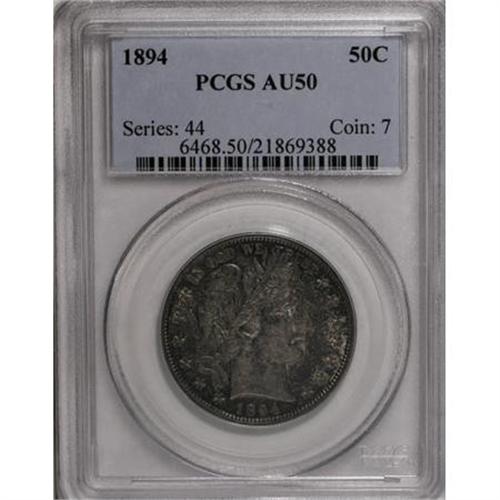 <B>1894 50C AU50 PCGS.</B></I> Light, even wear appears across the portrait, but the luster of the richly toned blue-gray and golden-tan fields is virtually intact. Minimally marked with strong eye appeal for the grade.<BR><BR><B>Coin Engraver:</B> Charles E. Barber<BR><BR><b>Shipping:</b> Coins & Currency (<a target="_blank" href="http://www.heritageauctions.com/common/shipping.php">view shipping information</a>)
