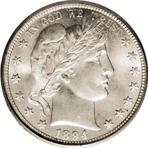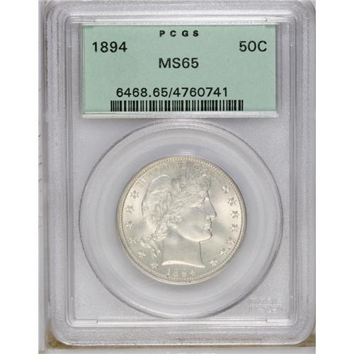 <B>1894 50C MS65 PCGS.</B></I> Despite the mintage of 1.148 million plus pieces, the 1894 is tough to locate in Uncirculated grades. Fewer than 30 MS65 coins have been certified, and less than 20 finer. Dazzling luster explodes from near-white satiny surfaces, and crisp definition characterizes the design features. A tiny mark or two on each side prevents an even higher grade. Population: 13 in 65, 9 finer (11/06).<BR><BR><b>Shipping:</b> Coin/Currency (<a target="_blank" href="http://www.heritageauctions.com/common/shipping.php">view shipping information</a>)