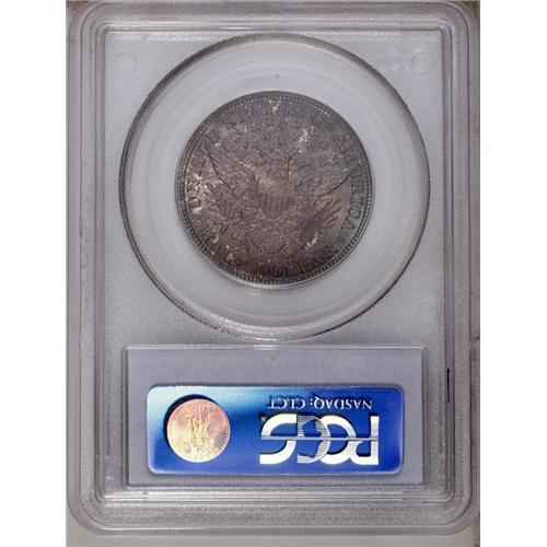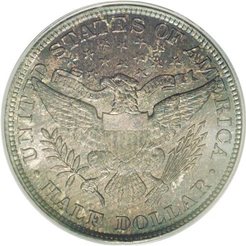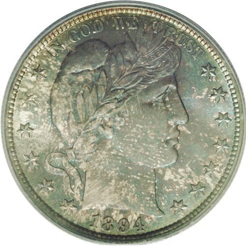 <B>1894<50C> MS67 PCGS.</B></I> Even though 1.14 million pieces were struck of the 1894-P, it is a most uncommon "common" date. Fewer than 100 examples have been certified in the MS64 to MS66 grade levels by PCGS. The Superb Gem offered in this lot is one of only two examples graded by either service, with none finer. Moreover, our records indicate that only one MS67 piece has been offered at public sale within the recent past<BR> The surfaces of this coin offer glowing luster blazing through medium intensity sky-blue, mauve, and lavender toning that takes on a somewhat mottled pattern. The strike is exquisite, with no areas displaying weakness, and there are no mentionable marks to report. A truly wonderful coin for the Barber half dollar specialist.