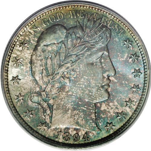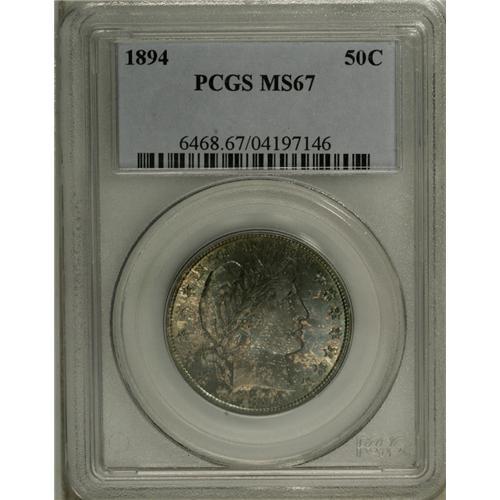 <B>1894 50C MS67 PCGS.</B></I> Even though 1.14 million pieces were struck of this issue, in Choice and finer, this "common" date becomes anything but, and a Superb Gem such as this is an extremely rare bird. NGC has graded no examples above MS66, and the Superb Gem offered in this lot is one of only two examples so graded by PCGS, with none finer. (11/06)<BR> The well-preserved fields of this Barber half possess glowing, flickering luster that shines beneath dappled apricot, mauve, peacock-blue, and lavender-rose patina. The strike is exquisite, and the wonderfully detailed devices betray only the most trivial marks. A thoroughly original and highly desirable example, perfect for the Barber enthusiast.<BR><BR><b>Shipping:</b> Coin/Currency (<a target="_blank" href="http://www.heritageauctions.com/common/shipping.php">view shipping information</a>)