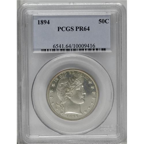 <B>1894<50C> PR64 PCGS.</B></I> Speckles of milky color visit reflective fields, which take on shades of tan-gold on the reverse. The surfaces provide a cameo-like effect, especially when the coin is tilted beneath a light source. The obverse elements are sharply defined, but the central reverse is somewhat weak. A few light handling marks are noted over each side. Population: 84 in 64, 69 finer (3/06). <BR><BR><B>Important notice:</B> Heritage usually auctions material at the rate of 200-250 lots per hour. On some occasions eBay Live bid software or the Internet may not be able to keep up with the pace of the auction. We recommend placing a realistic absentee bid now as insurance to avoid disappointment. Occasionally the auctioneer may eliminate or reject an eBay Live bid, and the auctioneer may also reopen a lot after the close of the eBay live bidding (usually because we missed an audience bid), and may reject your bid even if it shows you as the winning bidder. By bidding via eBay Live, you agree that Heritage may award the lot to another bidder at its sole discretion under the circumstances described above or any other reasonable circumstances. Since eBay bids are not shown to us until we open the lot on the floor, we treat those bids just like floor bids. In most cases the floor responds before the eBay bid is presented to us, due to Internet lag time, so for consistency we have made it a policy that floor bids are always considered first over tie eBay live bids. Also please note that all Heritage lots purchased through eBay Live carry a 20% Buyer's Premium. Please make sure you read the Terms and Conditions before you bid. This lot is being auctioned in conjunction with a live floor auction by Heritage Galleries & Auctioneers. All final auction and invoice information will be supplied by Heritage Galleries & Auctioneers, and all other information should be considered preliminary. Lot:2084 <BR><BR><B>Winning Notification and Billing:</B> After the FINAL session in this auction is complete, Heritage will send e-mail and snail mail invoices. This process normally takes several days. All final auction and invoice information will be supplied by Heritage Galleries & Auctioneers, and all other information should be considered preliminary. <BR><BR>This auction will be conducted on a live auction floor and over the Internet through eBay Live. If you choose to place an absentee bid, please take a moment to <font color='#0000ff'><u><a href='http://pages.ebay.com/liveauctions/help/before/laabsentee.html'>learn how eBay Live absentee bidding works</a></u></font><font color='#000000'>