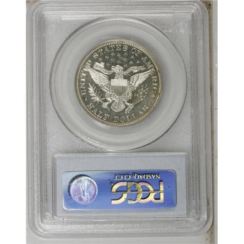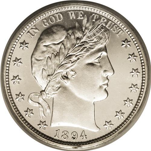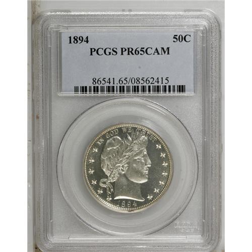 <B>1894<50C> PR65 Cameo PCGS.</B></I> This piece is an amazing Gem with exquisite contrast and fully brilliant silver surfaces on both sides, and an important example for the connoisseur. Every design element is fully detailed, right down to the tiny little B on Liberty's bust truncation. Although not the finest certified by the PCGS, this lovely proof has few peers. Population: 11 in 65 Cameo, 15 finer (9/06).