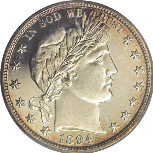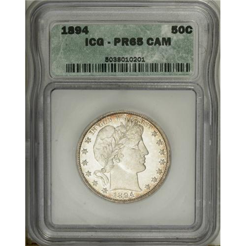 <B>1894 50C PR65 Cameo ICG.</B></I> Whispers of light gold-tan color around the obverse periphery yield to a more extensive and deeper lavender, cobalt-blue, and golden-brown coloration on the reverse border. Sharply delineated, frosty motifs rise majestically above deeply mirrored fields, providing for dramatic contrast. An occasional wispy handling mark does not distract.<BR><I>From The Monedas Oro Collection.</B></I><BR><BR><b>Shipping:</b> Coin/Currency (<a target="_blank" href="http://www.heritageauctions.com/common/shipping.php">view shipping information</a>)