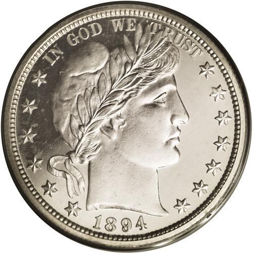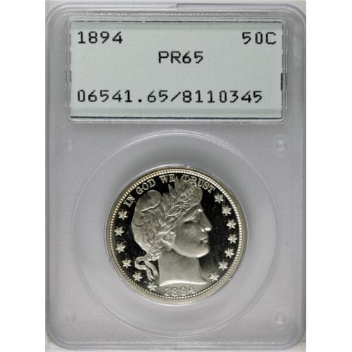 <B>1894<50C> PR65 PCGS.</B></I> Extremely well mirrored with obvious cameo tendencies, particularly on the reverse, although this is not mentioned on the first generation PCGS holder. Overall, the coin presents as brilliant and untoned, however a hint of golden color is at the center of the reverse, and some milky patina is on Liberty's cheek.