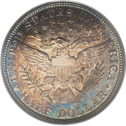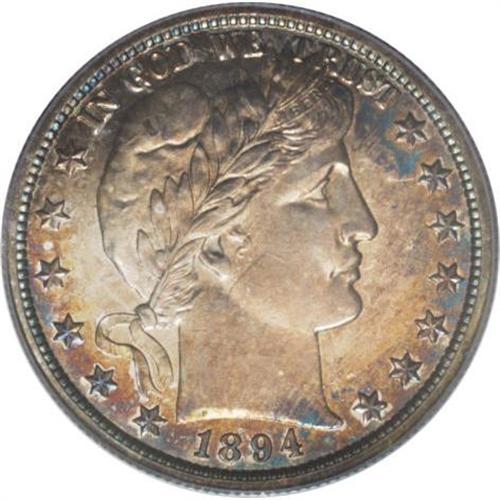 <B>1894 50C PR65 PCGS.</B></I> The proof mintage for 1894 was a moderately high 972 pieces, but PCGS as of (4/07) has certified only 33 pieces in Gem condition, with 33 coins finer. Beautiful sky-blue toning at the rims cedes to fuchsia centers, but the luster emerges essentially unimpeded from beneath the moderate patina. A touch of strike weakness appears at the upper right shield corner, but otherwise this piece is nearly free of mentionable distractions.<BR><BR><b>Shipping:</b> Coins & Currency (<a target="_blank" href="http://www.heritageauctions.com/common/shipping.php">view shipping information</a>)