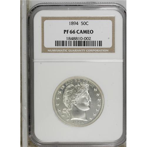 <B>1894 50C PR66 Cameo NGC.</B></I> Bright snow-white overall, the fields are nicely mirrored and unhairlined. The devices show a moderate amount of frosting to provide the cameo contrast. Just a little striking softness is noted on the eagle's right (facing) wing, close to the shied. Very scarce in this lofty grade. The combined NGC and PCGS population reports show a total of 28 pieces graded this high, with 13 certified finer (1/07).<BR><BR><b>Shipping:</b> Coins & Currency (<a target="_blank" href="http://www.heritageauctions.com/common/shipping.php">view shipping information</a>)