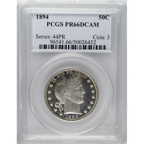 <B>1894 50C PR66 Deep Cameo PCGS.</B></I> Lightly gold-toned with immense reflectivity and thick frost on the boldly impressed devices. The contrast is far stronger than that seen on most Cameo pieces, and the designation is entirely appropriate. This is the <I>only</B></I> Deep Cameo example of this issue certified by PCGS, and the high level of preservation merely confirms the importance of this specimen. (11/06)<BR><BR><b>Shipping:</b> Coin/Currency (<a target="_blank" href="http://www.heritageauctions.com/common/shipping.php">view shipping information</a>)