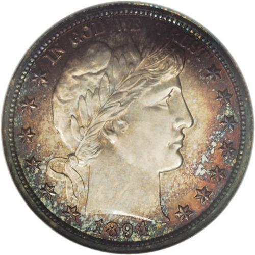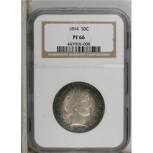 <B>1894 50C PR66 NGC.</B></I> A sharply detailed Gem proof example, this piece approaches the finest quality ever seen for the date. Both sides have exceptional contrast with fully lustrous devices, although the contrast is diminished by moderate to deep iridescent toning, preventing a specific Cameo designation for this piece. Census: 26 in 66, 24 finer (4/07).<BR><BR><b>Shipping:</b> Coins & Currency (<a target="_blank" href="http://www.heritageauctions.com/common/shipping.php">view shipping information</a>)